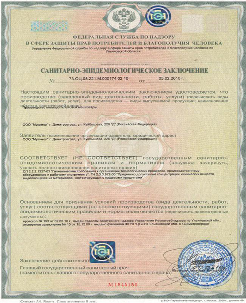 Санитарно-эпидемиологическое заключение мешки тканные ПП