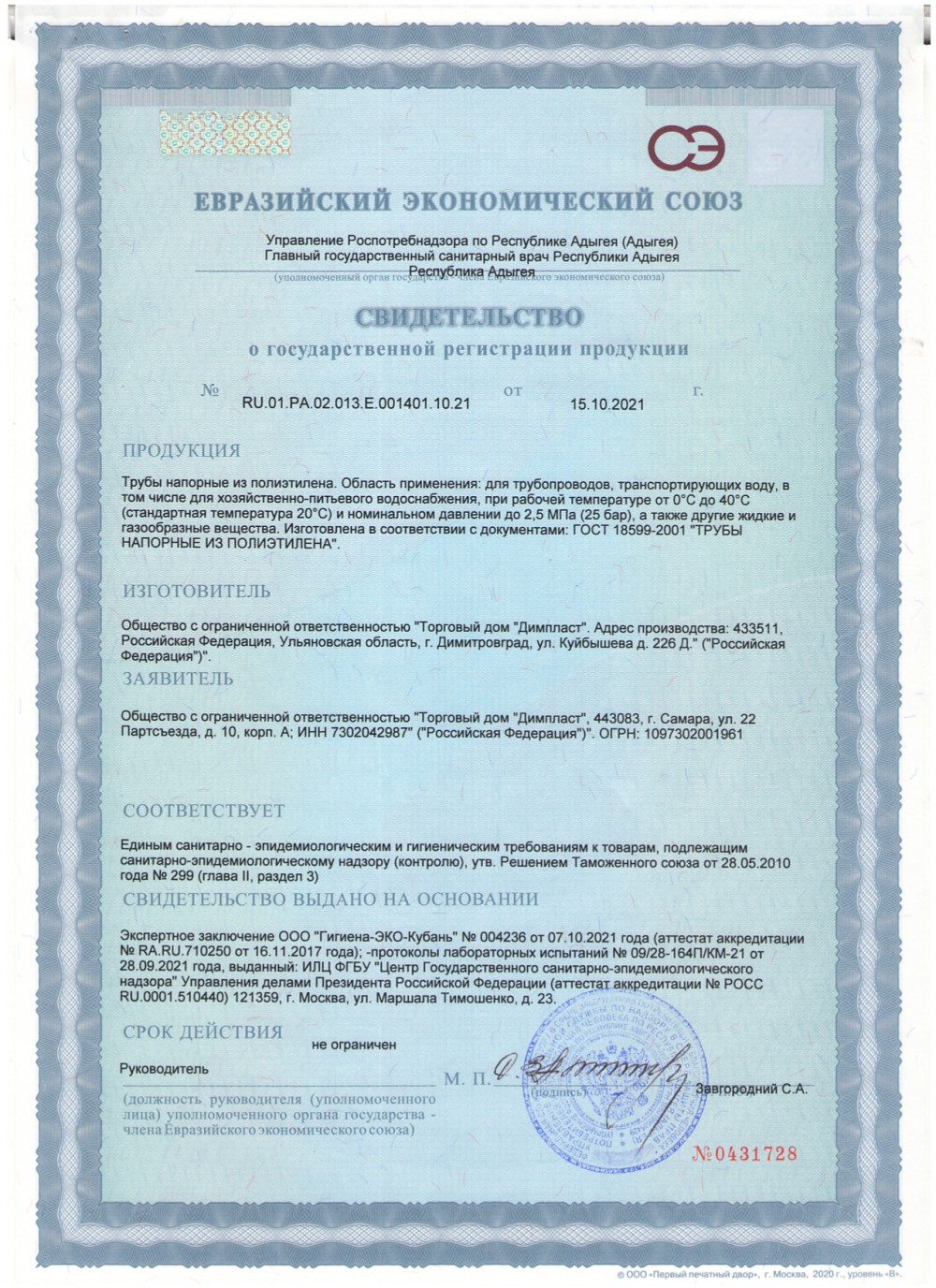 Была приобретена линия по производству полиэтиленовых труб диаметром от 20 до 63 мм от производителя Battenfeld GmbH. (Германия), что позволило увеличить производственные мощности полиэтиленовых труб на 1500 тонн в год.